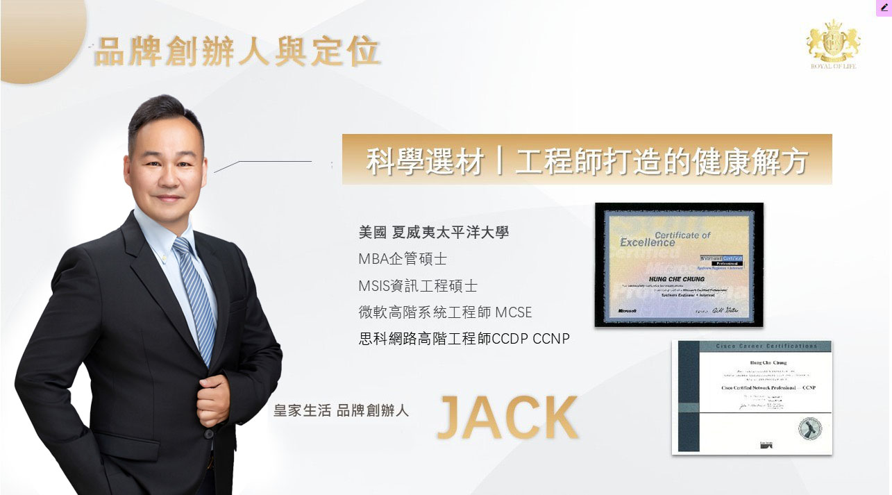 Jack 結合科技背景與企業實踐力,用工程師的細節思維與國際標準,設計每一項配方。每一支產品都經他親自試用、監製,只為讓「有效」變成看得見的答案。
